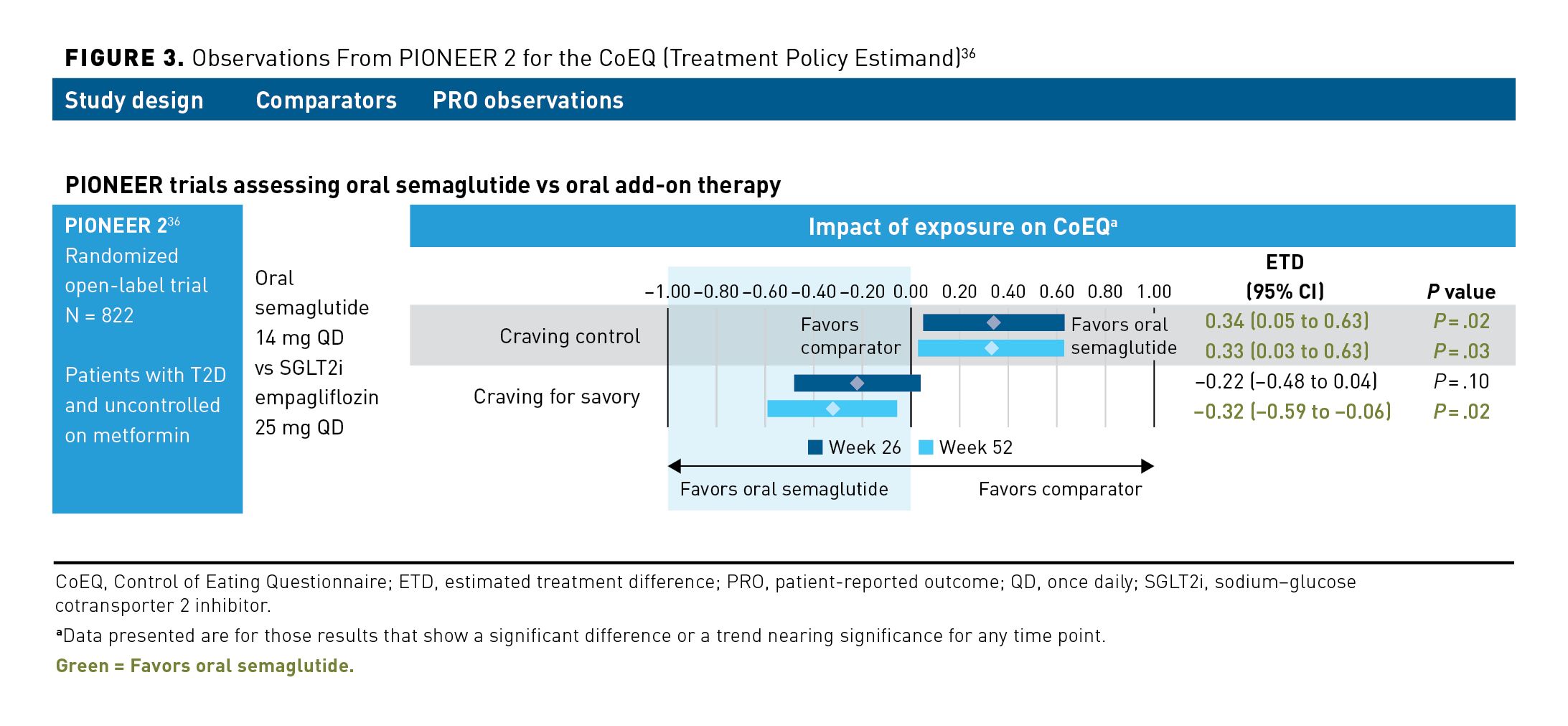 The Control of Eating Questionnaire (CoEQ) was used in PIONEER 2 and 3.36,37 This is a reliable and validated tool comprising 21 items designed to assess the intensity and type of food cravings, subjective sensations of appetite and mood, and the individual’s perceived level of control against a craved food item.17 The PIONEER clinical trial program used a modified version of the CoEQ (items 3-19 in the questionnaire), with the 2 open-ended items (20 and 21) for patient-perceived level of control over resisting their own “problem” food excluded.