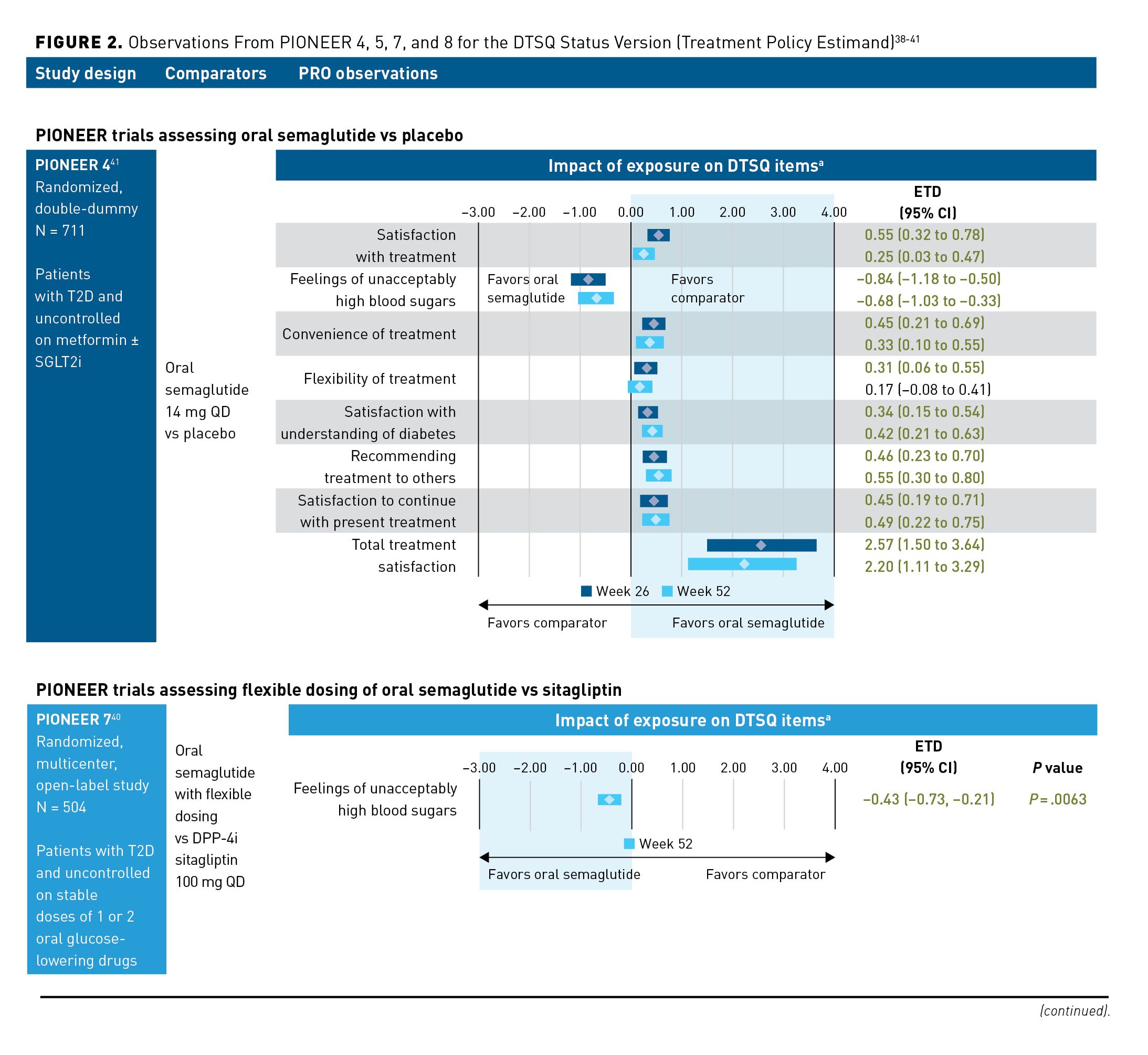 ETDs between oral semaglutide and its comparators for the DTSQs were collected in PIONEER 4, 5, 7, and 8 (Figure 2).38-41 For feelings of unacceptably high blood sugars (item 2), the ETDs significantly favored oral semaglutide over placebo (PIONEER 5 and PIONEER 8) and sitagliptin (PIONEER 7).38-40