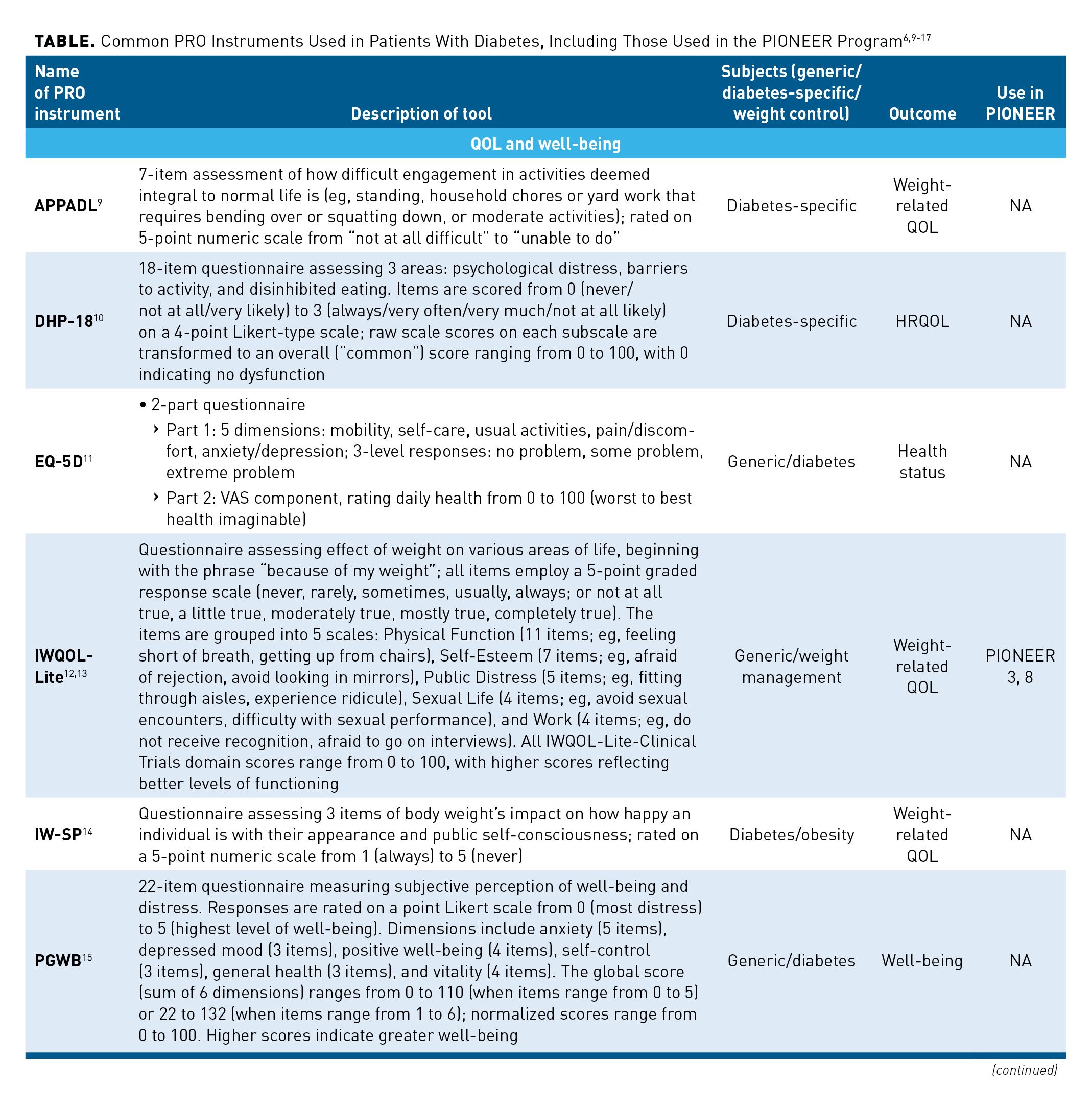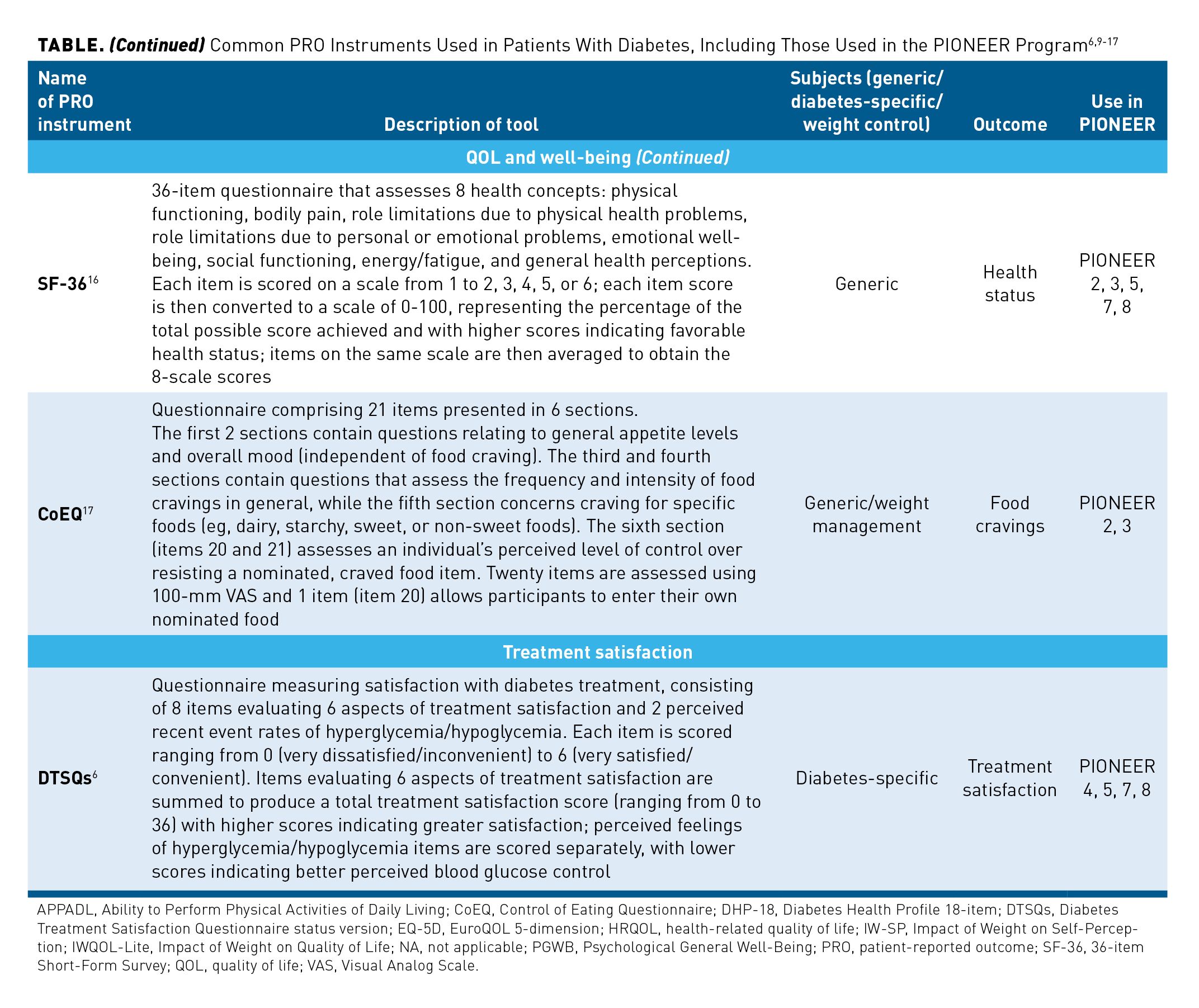 Clinicians, researchers, and regulators agree that assessing PROs in those with T2D can significantly contribute to treatment decisions in daily practice.8 As PROs reflect the patient’s experience, they can complement clinical outcomes, helping health care professionals better understand the patient’s perception of living with the disease and the physical, social, and emotional impact of treatment regimens on their daily lives.8 There are several well-established PRO instruments used in patients with T2D, as shown in the Table.6,9-17