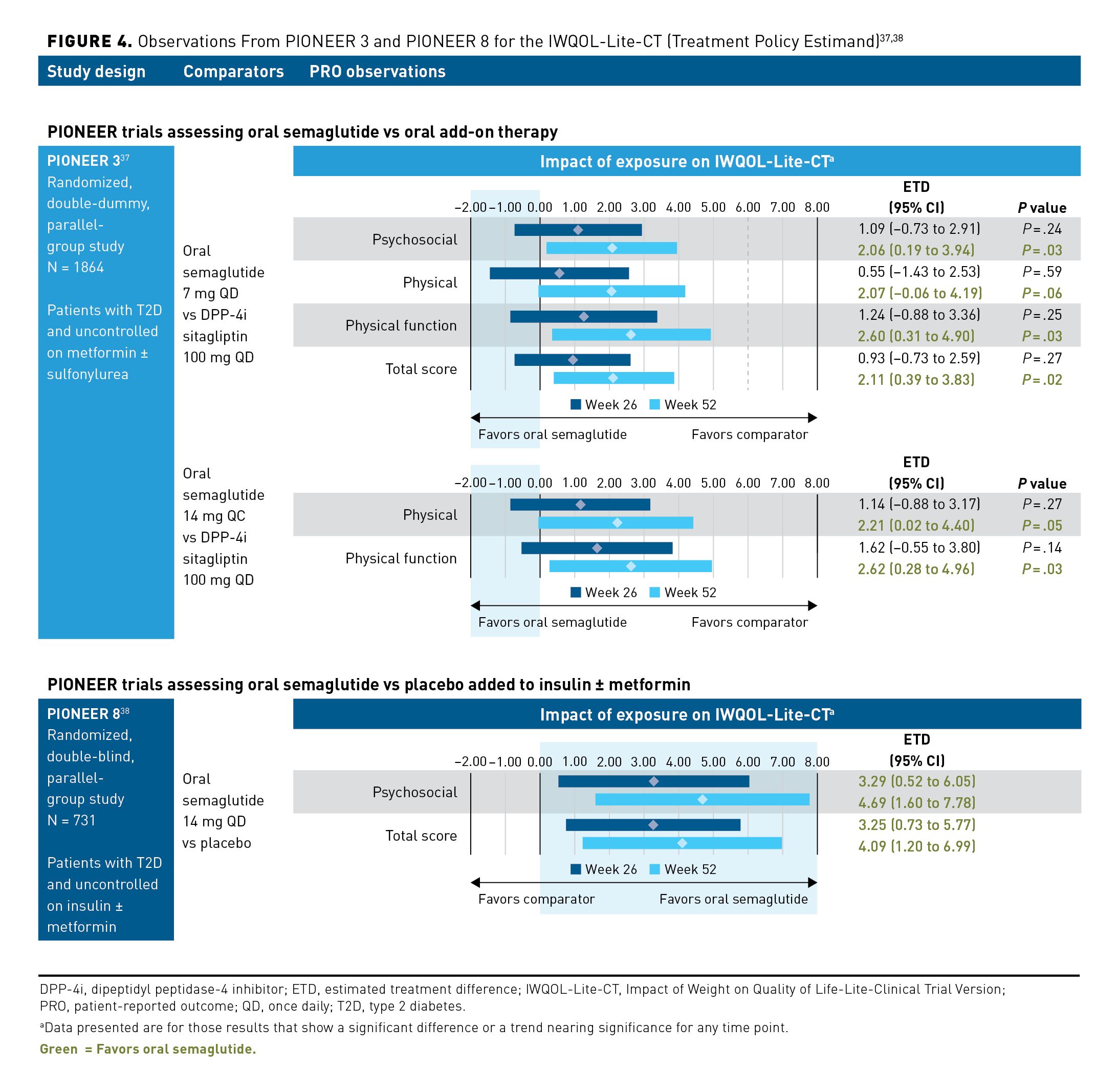 In patients with more advanced disease (PIONEER 8), the ETD significantly favored oral semaglutide 14 mg over placebo for the psychosocial domain and IWQOL-Lite-CT total score at weeks 26 and 52.38 Reductions in body weight resulting from the addition of oral semaglutide may be reflected by improved patient mood.38