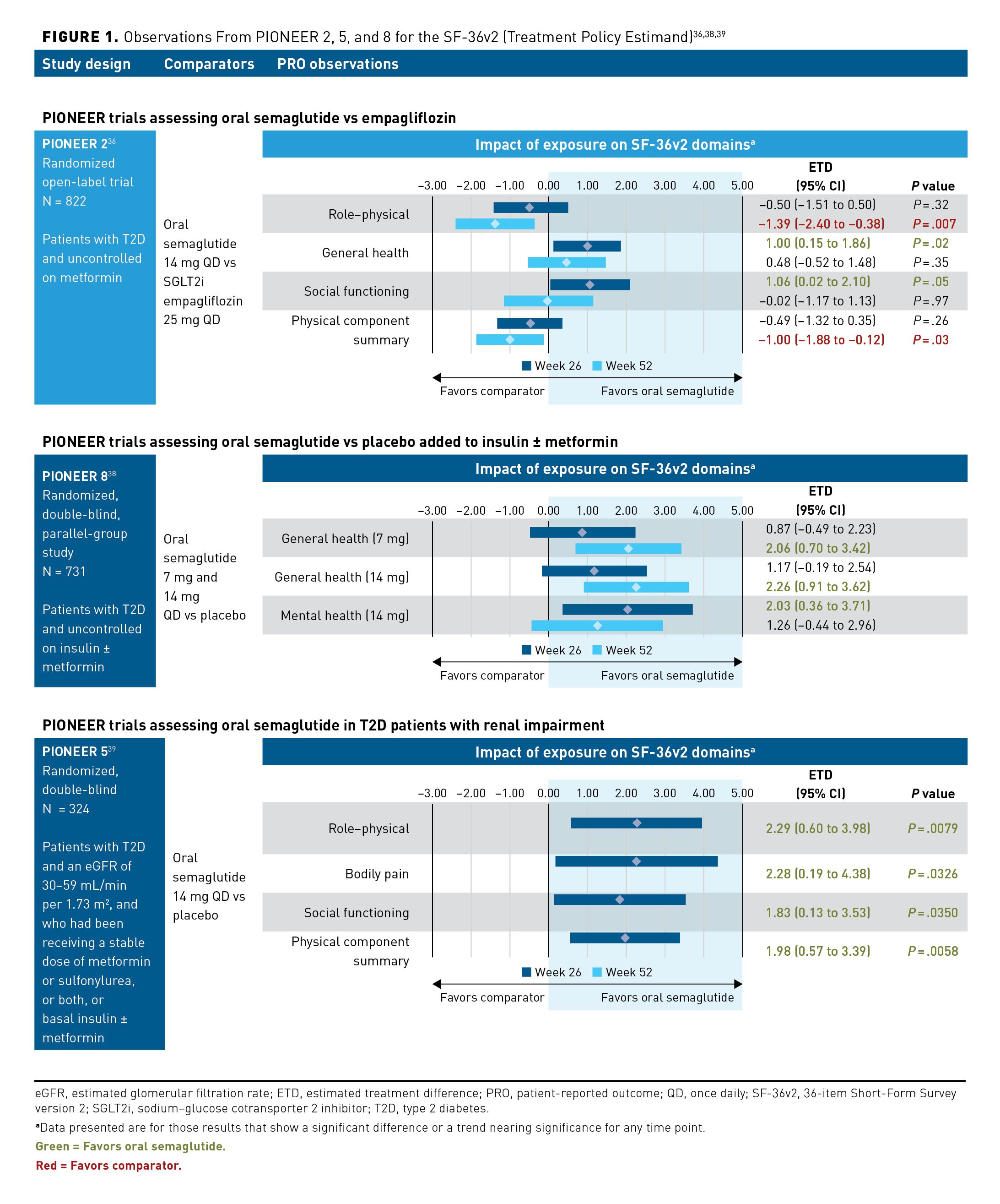 For patients in PIONEER 8 who had more advanced T2D uncontrolled despite receiving insulin with or without metformin, the ETDs significantly favored oral semaglutide over placebo for general health at week 52 (7 mg and 14 mg) and mental health at week 26 (14 mg). These improvements were observed along with the superior reductions reported in A1C levels and body weight with oral semaglutide versus placebo.38 In patients with renal impairment in PIONEER 5, the ETDs at week 26 significantly favored oral semaglutide 14 mg over placebo for the physical component summary and the role-physical, bodily pain, and social functioning domains.39