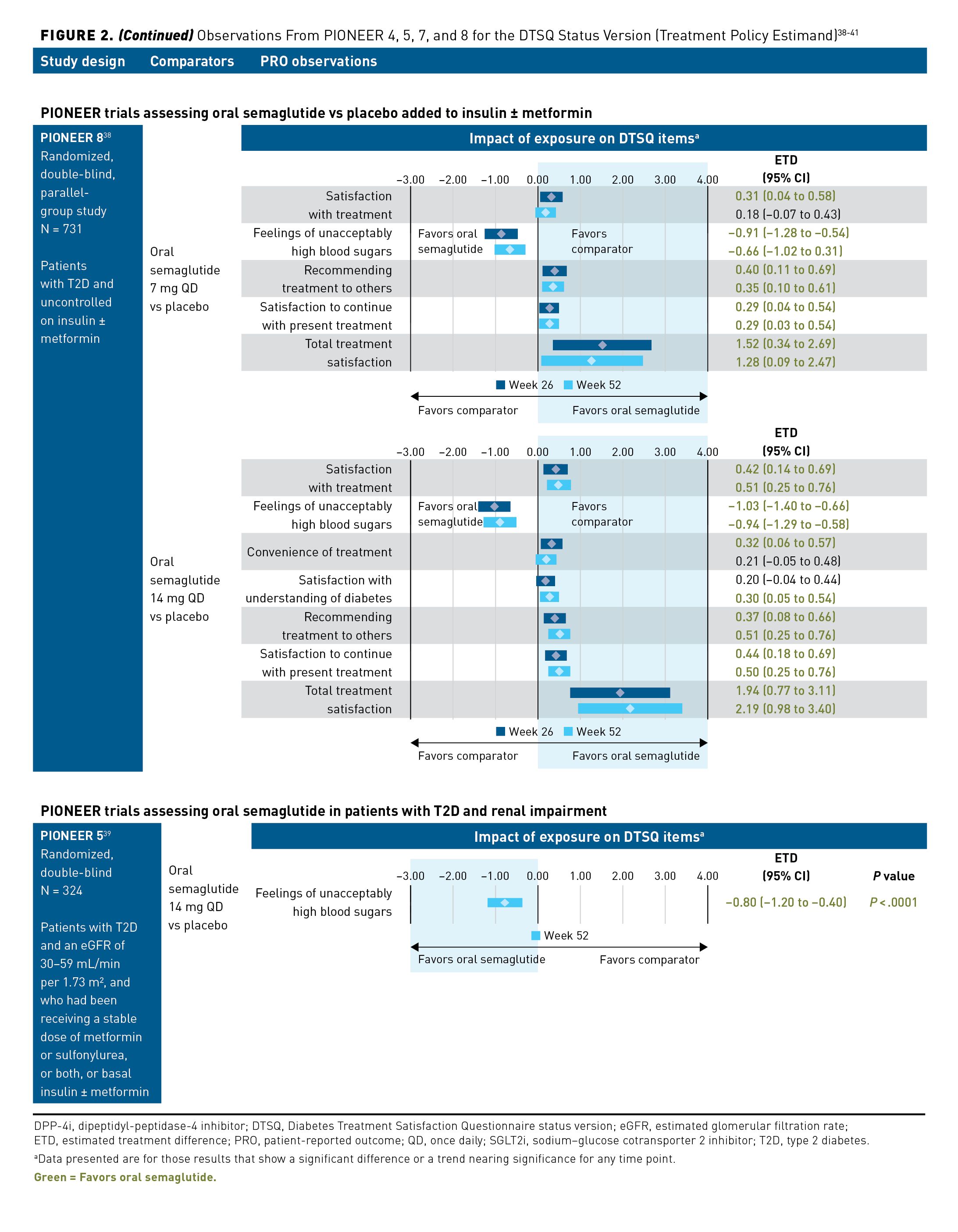 In PIONEER 4, the ETDs favored oral semaglutide 14 mg over placebo for all questions at weeks 26 and 52, except flexibility of treatment (week 52) and feeling of unacceptably low blood sugars at weeks 26 and 52.41 There were no differences between oral semaglutide 14 mg and liraglutide 1.8 mg across any of the questions.41