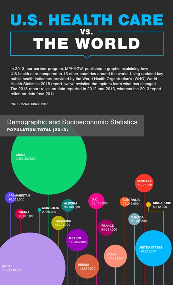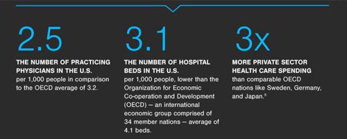 To explore these issues further, MHA@GW—the online Executive Master of Health Administration program at George Washington University—produced an infographic comparing US healthcare to 16 other Organization for Economic Co-operation and Development (OECD) nations. The following provides an overview of factors that affect the quality of healthcare in the US and a comparison of how other countries spend their healthcare dollars.