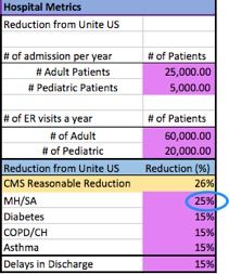 Note: The mental health and substance abuse calculator is based on national averages, without regard to patients treated in dedicated substance abuse and mental health facilities. Therefore, these numbers are more accurate for facilities with dedicated inpatient mental and substance treatment. Still, these numbers only look at readmissions and their associated costs. Savings could be higher when looking at a window beyond the standard 30 days, or admissions that are complicated with mental health as a comorbidity.