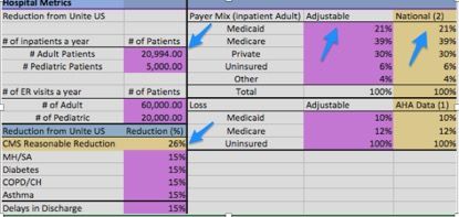 Note: The column on the far right titled “national” always remains fixed. This column is fed by CMS national average data and provides a national benchmark for your specific hospital’s metrics. The column titled “adjustable” is where you can input your hospital figures, such as the percentage of Medicaid, Medicare, private, and uninsured patients served. The purple cells in the far-left column allow you to customize the number of inpatients you see per year, and define the percentage of readmission by specific medical conditions.