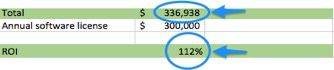 It is important to select an ROI metric that has a direct and clear-cut cause and effect. In our example above, we selected “employee hours saved,” because there is a direct cause-and-effect relationship between employee hours saved and cost avoidance associated with this reduction. If we had selected “additional revenues” as the metric of our ROI, this would make our argument more ambiguous, and therefore harder to prove, because there are many variables that can claim a cause-effect relationship on revenues.