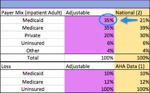 By changing the adjustable fields, you can customize the calculator to fit your hospital’s numbers. For example, if 35% of those served by your hospital are Medicaid patients, you can adjust that percentage in the purple column (Graphic 3).