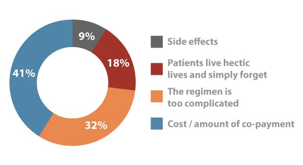 Poor adherence to medication has been a major topic at the 75th Scientific Sessions of the American Diabetes Association. Which item is most likely to cause patients to fail to take medication as prescribed?