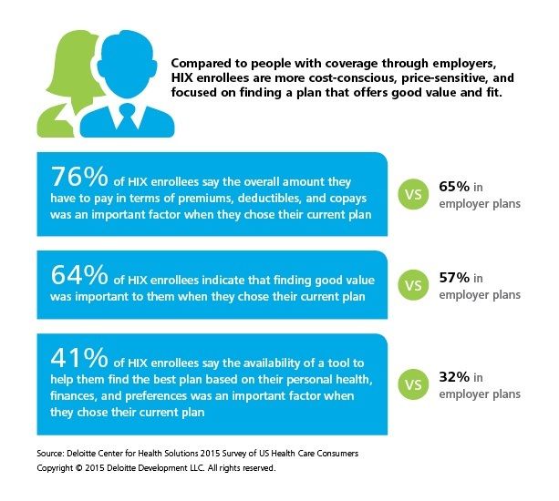 In a slight contradiction to the findings of the J.D. Power survey, the 2015 Survey of US Health Care Consumers from Deloitte Center for Health Solutions found that enrollees who purchased plans on the public health insurance exchanges are less likely to be satisfied with their current health plan compared with individuals in employer plans or Medicare.