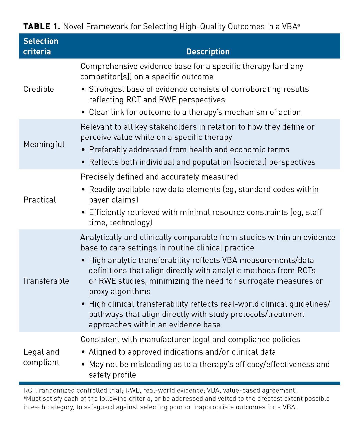 A high-quality outcome measure in a VBA, applied equally to the drug of interest, as well as any comparator group, should satisfy the following criteria to the highest degree possible: It should be (1) credible, (2) meaningful, (3) practical, (4) transferable, and (5) compliant (legal) (Table 1).