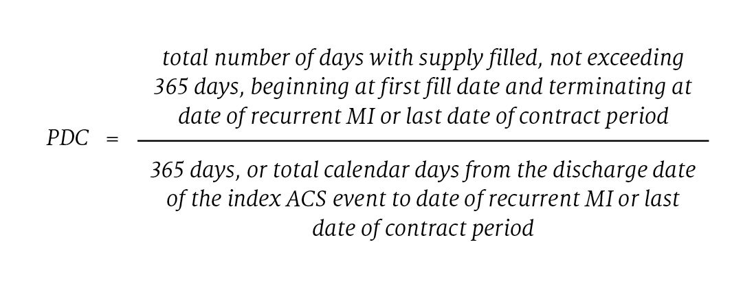 6. Patients on ticagrelor and clopidogrel were required to have a PDC for ticagrelor or clopidogrel at 80% or higher throughout the time period for which they were followed during the contract period after their index event, calculated as follows: