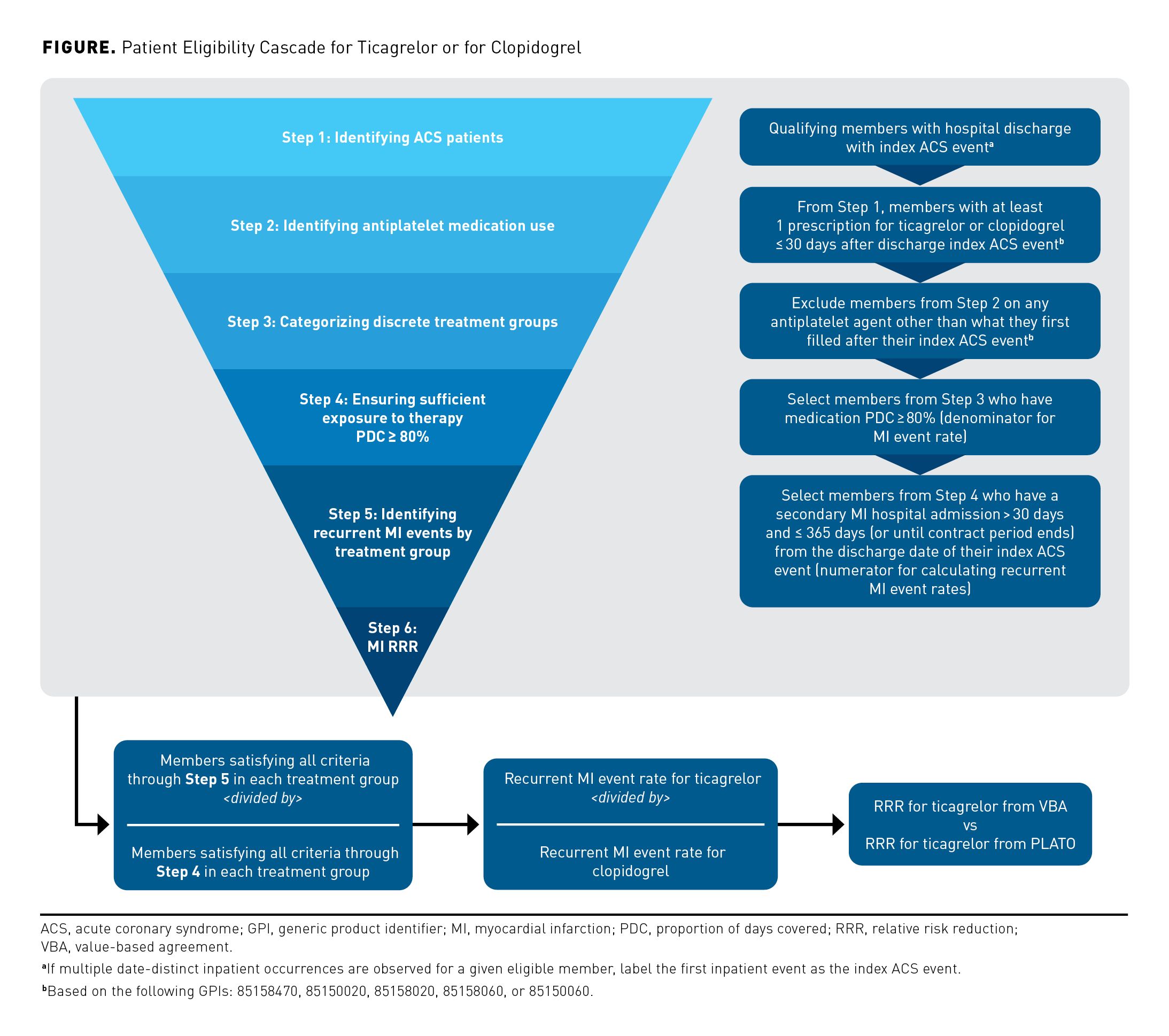 Consistent with PLATO study results and the FDA-approved indication for ticagrelor,31 a VBA framework was developed based on superiority for ticagrelor over clopidogrel in reducing the risk of a second MI after an initial ACS event. This framework was implemented within national and regional US payer settings, including commercial insurance and Medicare Part D populations. Recurrent MI was chosen as an appropriate outcome for VBA purposes because it satisfied all 5 criteria in our VBA framework development process (Table 1):