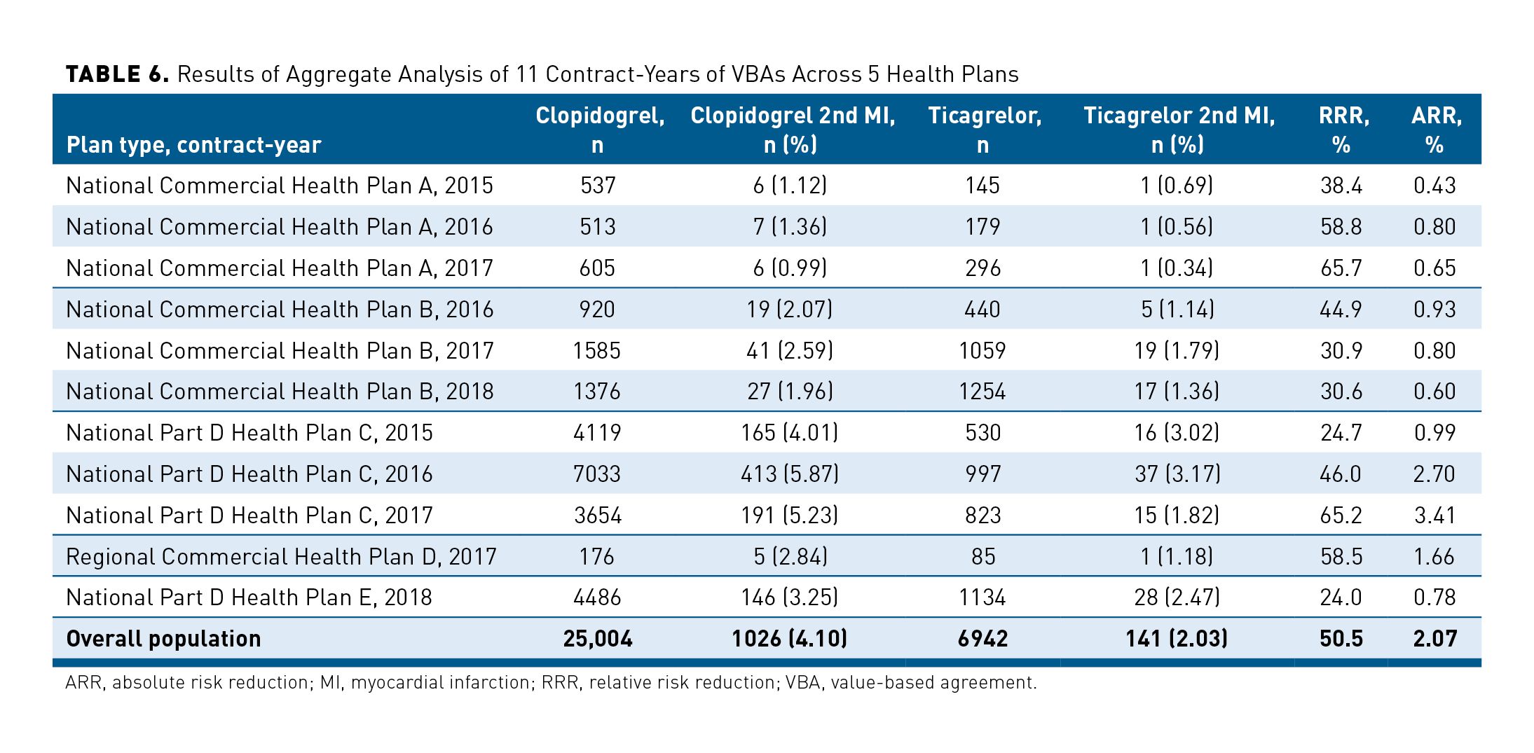The ticagrelor VBA framework was implemented across 5 distinct health plans utilizing a common analytic framework and outcomes reporting structure. In all, there were 11 contract-years of VBA experience for ticagrelor implemented across these 5 health plans between 2015 and 2018. Seven of the 11 contract-years (63.6%) were executed within commercially insured ACS patient populations, and the remaining 4 contract-years (36.4%) were within Part D populations. Data capture on patient characteristics was limited mainly to those required for filtering through eligibility criteria enabling measurement of recurrent MI event rates and generating RRR estimates between treatment groups; however, the Medicare Part D population was required to be aged at least 65 years.