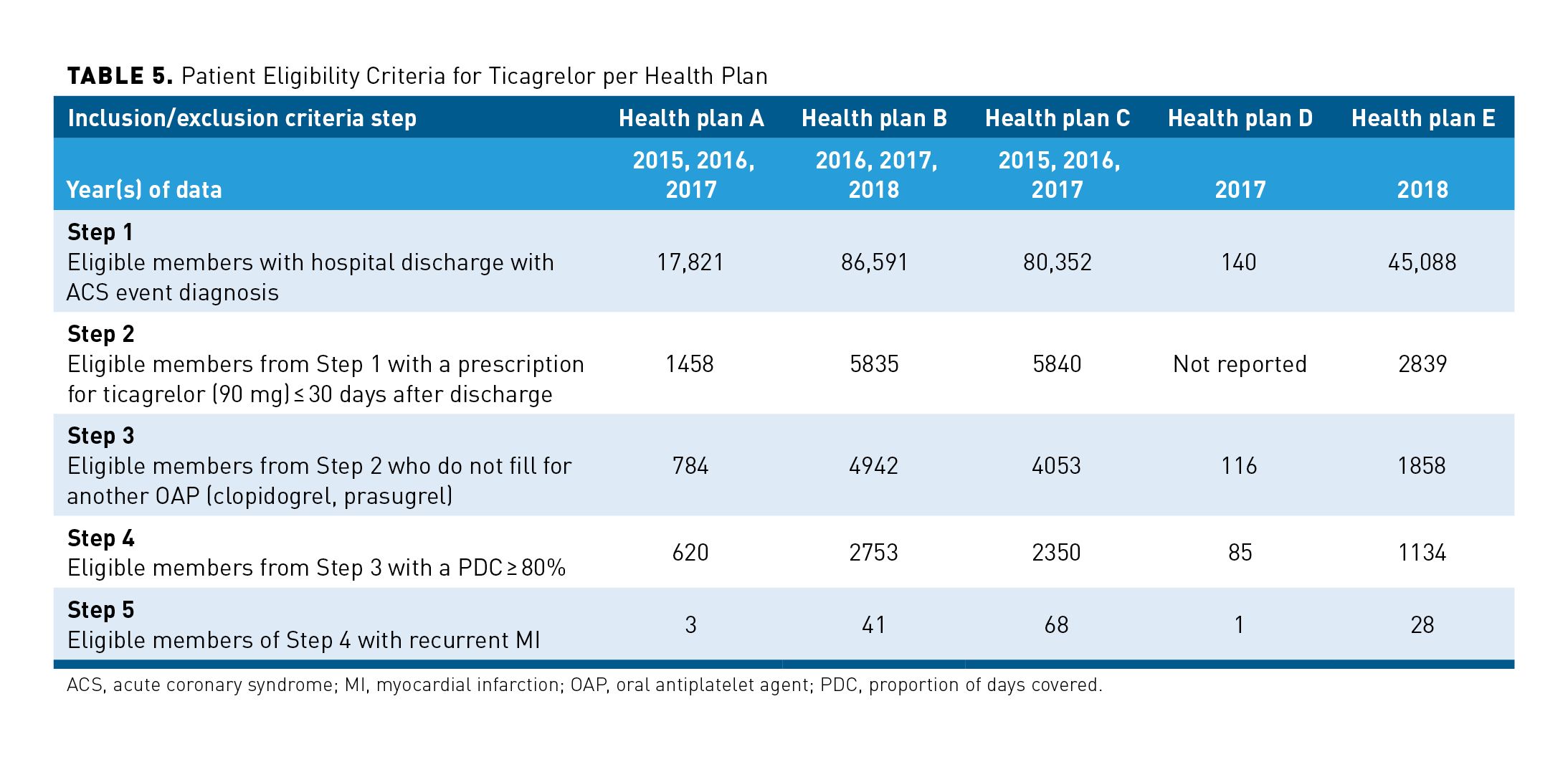 5. Patient data were excluded from VBA analysis if any antiplatelet therapy other than that initially used to treat their index ACS was filled by the patient from discharge date of their index event until either the end date of the contract period or date of second MI.