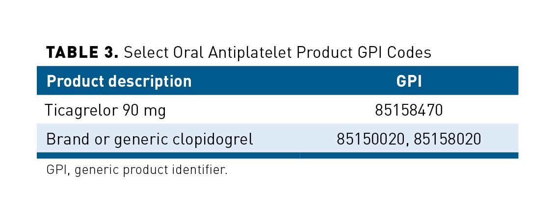 3. Patients received a prescription for first use of ticagrelor or clopidogrel within 30 days post discharge following the index ACS event, identified using applicable national drug codes (NDCs) mapped to specific generic product identifier (GPI) codes. As there are a considerable number of NDC codes present for these products, only the representative GPI codes are provided (Table 3).