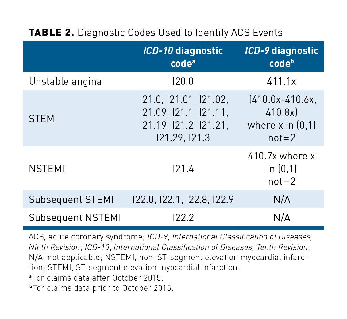 1. Patient diagnoses of ACS were identified according to International Classification of Diseases, Ninth and Tenth Revisions (ICD-9, ICD-10) codes for unstable angina, STEMI, non-ST elevation myocardial infarction (NSTEMI) (ICD-9, ICD-10; ICD-9 used for service claims prior to October 2015) (Table 2).