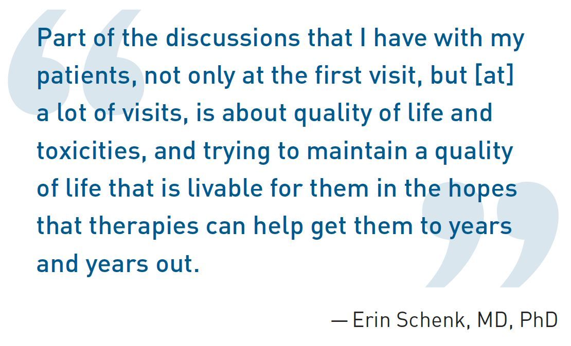 Dr Mok believes that appropriate/accurate assessment of QOL is critical. Efforts are being made at his institution to pinpoint key determinants by using QOL surveys and other patient-reported outcomes; these tools have helped his organization collect large amounts of patient feedback. He explained that technology can only help so much when it comes to assessing this conundrum, rather, he believes that it is much more beneficial to have “an engaged patient” who provides “real-time feedback.” The data are limited, but a better understanding of patient-reported outcomes and real-world evidence (RWE) would be most beneficial for integration into patient management at an aggregate level. Dr Schenk agreed that adequate QOL for each patient during treatment is the priority—consideration of the many different variables that can have an impact (eg, adverse effects [AEs], financial cost) is crucial. She states, “part of the discussions that I have with my patients, not only at the first visit, but a lot of visits, is about quality of life and toxicities, and trying to maintain a quality of life that is livable for them in the hopes that therapies can help get them to years and years out.”