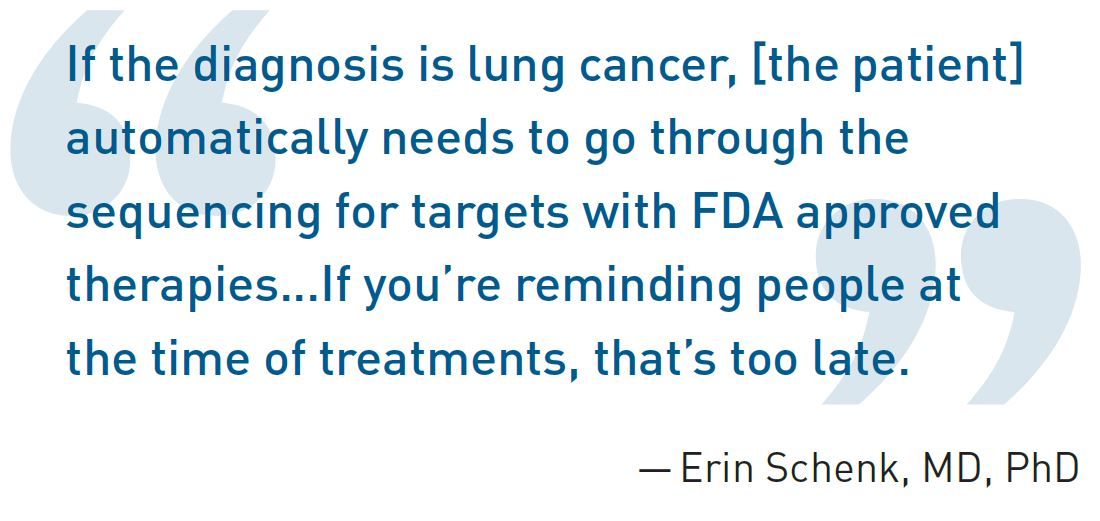 Most of the experts practice at prominent academic institutions, so extensive molecular testing is ordered before first-line therapy begins. Dr Schenkbelieves that as soon as a lung cancer diagnosis is entered into the EMR system, the record should be flagged immediately so that genomic testing is completed before systemic therapy is started. This process can help patients receive the correct therapy as soon as possible and may assist with lessening resistance in ALK-targeted treatment. She believes that if first-line therapy is initiated without genomic testing, the physician is already too late, and that a genomic testing initiative could have substantial clinical and economic benefits down the line if implemented on a national scale.