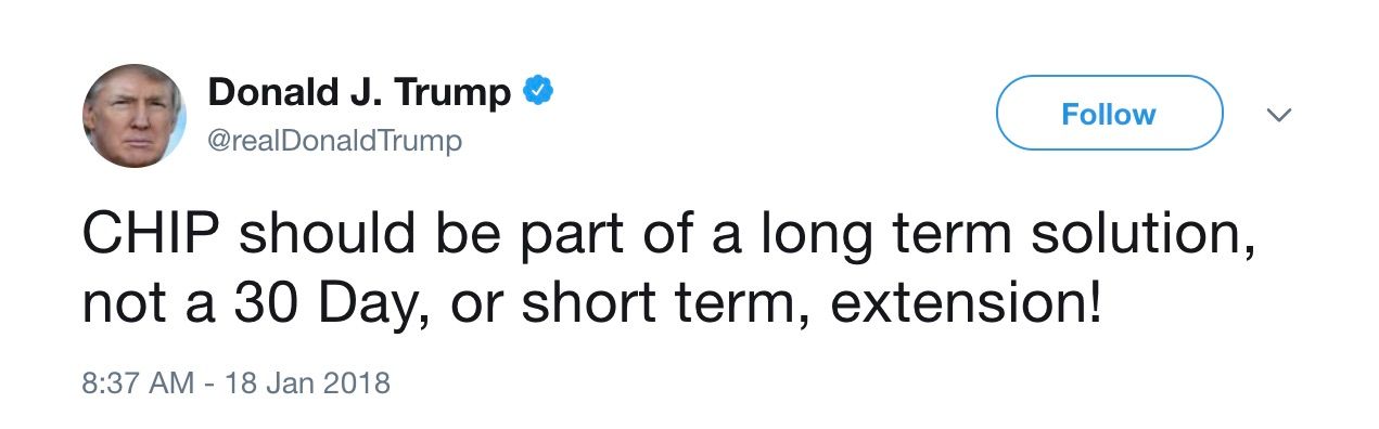 The tweet contradicted Republican strategy to avoid the shutdown by adding a 6-year extension to fund CHIP to the short-term spending bill scheduled to be voted on in the House as early as Thursday.