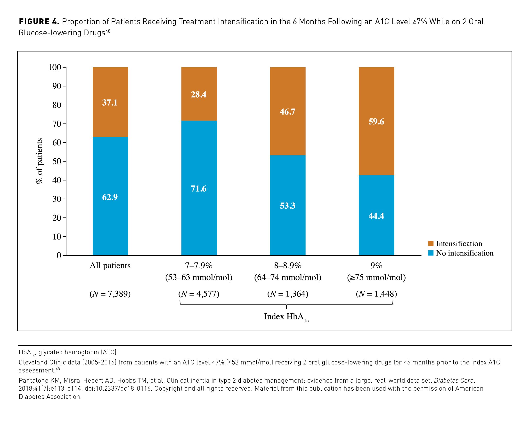 Inertia in T2D relates to lack of timely adherence to guideline recommendations (ie, clinical inertia), and more specifically the failure to intensify or deintensify T2D therapy in a timely manner (ie, therapeutic inertia).50 Such inertia can occur in primary care or specialist settings at any stage of therapy,47 and has been reported within managed care populations in the United States.51 Failure to intensify treatment within 6 months of an A1C level of at least 7% was reported in 63% and 86% of patients with T2D receiving 2 oral glucose-lowering agents in 2 separate US studies.48,52 Furthermore, it was reported that 44% did not receive intensification even after their A1C level reached 9% or higher (Figure 4).48 The time to intensification after an above-target A1C measurement is typically 1 to 5 years in patients treated with more than 1 oral antidiabetic drug.47 Therapeutic inertia was associated with worse glycemic control after 12 months’ follow-up (mean A1C reductions of 0.59% vs 0.25% with and without intensification, respectively; P < .001).52