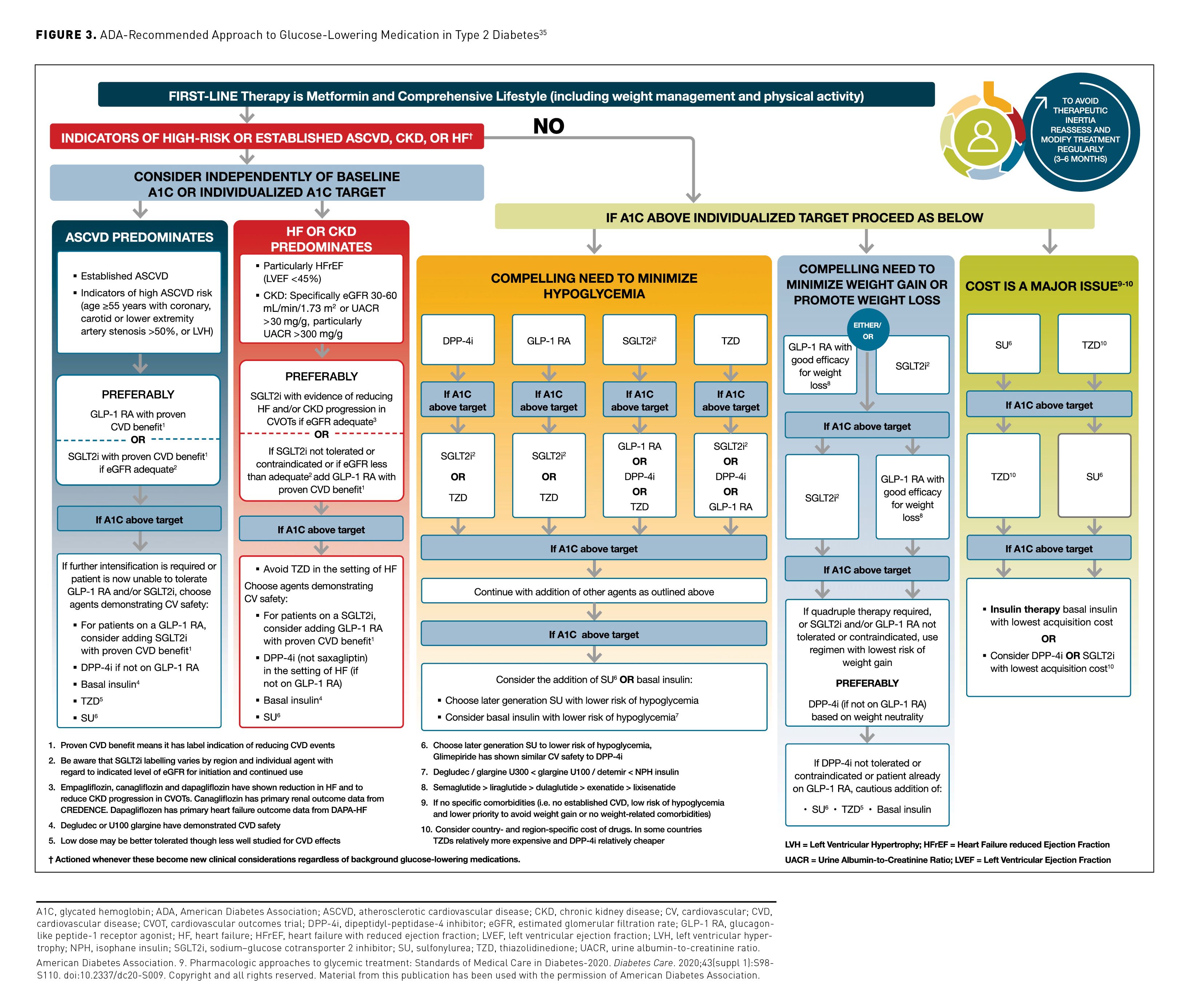 The latest Standards of Medical Care in Diabetes from the ADA and American Association of Clinical Endocrinologists/American College of Endocrinology (AACE/ACE) recommend glycated hemoglobin (A1C) targets less than 7.0% (ADA) or 6.5% or less (AACE/ACE).11,41 After initial lifestyle modification and first-line pharmacotherapy (typically metformin), patients with uncontrolled T2D should receive add-on therapy, with treatment selection dependent on individual circumstances.11,35 Based on ADA Standards of Medical Care (Figure 335), patients without indicators of high-risk or established atherosclerotic CVD (ASCVD), CKD, or heart failure (HF) should receive add-on therapy with: