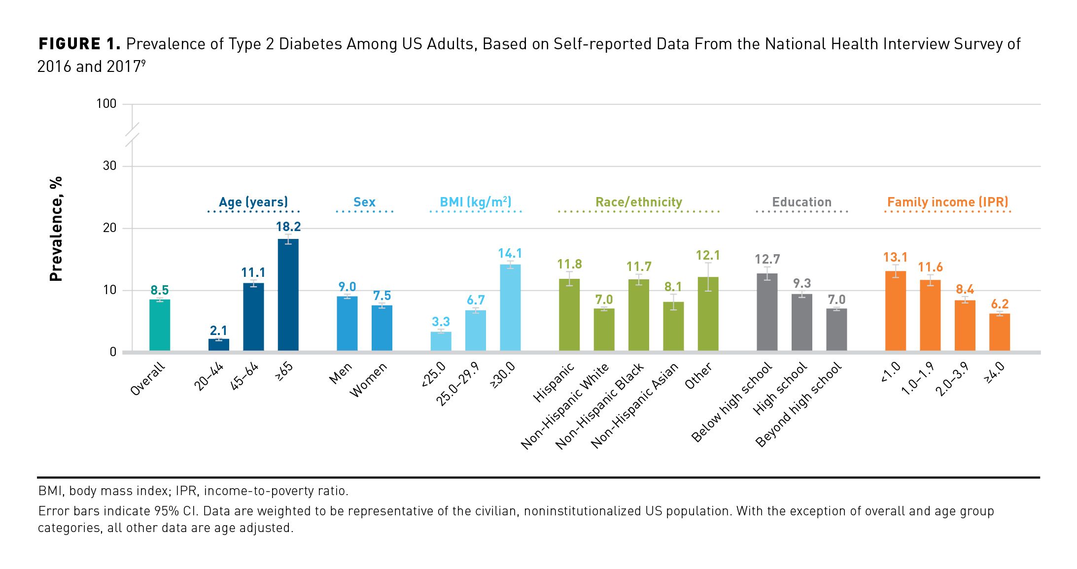 Despite the decline in the incidence of diabetes in the United States, prevalence remains high but has plateaued since 2009.1,8 Current estimates suggest that 26.9 million adults had diagnosed diabetes in 2018, and an additional 7.3 million adults had undiagnosed diabetes, which together represents 13% of all US adults.1 The high prevalence, despite declining incidence, is likely due to patients living longer following diagnosis, owing to reductions in cardiovascular (CV) morbidity and mortality.8