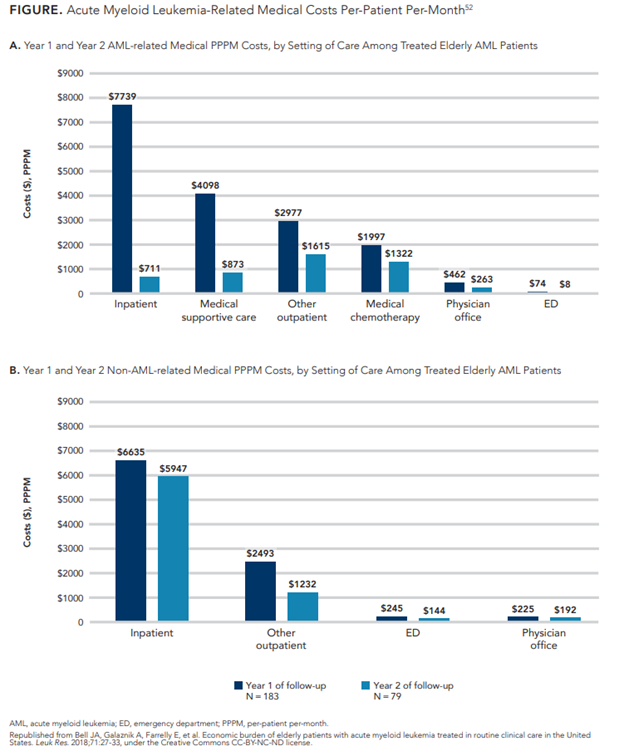Another retrospective cohort study evaluated claims data to determine healthcare resource utilization and direct healthcare costs, as well as the relationship with clinical outcomes for patients with AML. The study defined episodes by treatments, including high-intensity chemotherapy regimens, low-intensity chemotherapy (LIC), and HSCT. LIC was defined as LDAC, anthracycline, azacitidine, decitabine, clofarabine, or gemtuzumab ozogamicin administered in the outpatient setting. Of note, none of these data included the current NCCN-preferred regimens for patients 60 years or older determined unfit for intensive chemotherapy due to the date of analysis (2008-2016). Mean total costs for LIC were $53,081, and 35.8% of patients had at least 1 inpatient hospitalization during the study period, costing a mean of $49,580.55 As both studies demonstrated the primary driver of medical costs to be inpatient hospitalization, optimization of new outpatient-based regimens to prevent unplanned inpatient hospitalizations may be key to minimizing healthcare costs.