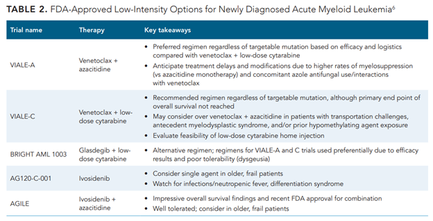 Treatment options for patients with newly diagnosed AML have grown exponentially in the past 5 years due to the approval of novel agents. The FDA has approved 5 lower-intensity regimens for patients who are treatment naïve and ineligible for intensive chemotherapy (Table 26). The National Comprehensive Cancer Network (NCCN) guidelines provide a framework for approaching patients 60 years or older who are not candidates for intensive therapy, including the use of FDA-approved therapies as well as agents and combinations with clinical benefit. Categories of therapy recommendations are stratified based on mutation status: AML without actionable mutation, isocitrate dehydrogenase (IDH) 1 or 2 mutation, or fms-like tyrosine kinase 3 (FLT3) mutation.15