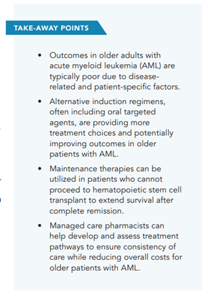 The treatment of AML in older adults is a rapidly changing landscape due to the introduction of novel agents and combinations that show a promise of long-term remission for a population that has historically not been offered, did not tolerate, or did not respond to conventional cytotoxic chemotherapy. Managed care organizations and pharmacists can help bridge the gap by recognizing the expanding indications of current drugs while staying up-to-date on new therapies, including targeted agents. As AML moves from a disease with a definitive induction, consolidation, and remission to one that may involve long-term treatments and maintenance therapies, managed care professionals must realize the nuances of these therapies to determine the value of these medications balanced with realistic outcomes, patients’ wishes, and goals of care.6,67