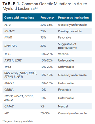 Irrespective of treatment modality, outcomes in older adults with AML are worse than young adults due to both disease-related and patient-specific factors. Patients older than 64 years have a 5-year relative survival rate of just 9.4%.1 Antecedent hematologic disorders (myelodysplastic syndrome [MDS] and myeloproliferative neoplasms) or secondary AML occur in 24% to 40% of older patients diagnosed with AML, portending difficult-to-treat disease.2 In addition, older patients with AML typically have higher numbers of chromosomal aberrations, including mutations in genes that confer resistance to many treatments.3 In particular, TP53-mutated AML is less likely to respond to conventional chemotherapy treatments; the overall survival (OS) at 2 years is less than 10%.4 Molecular abnormalities not only inform prognostic discussions, but also can be the basis for targeted therapies. See Table 15,6 for common genetic mutations in AML.