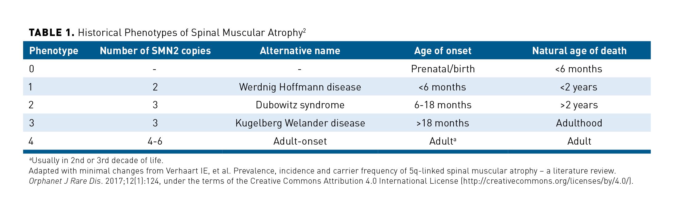 Spinal muscular atrophy (SMA) describes a diverse group of inherited neuromuscular disorders characterized by degradation of the lower motor neurons causing progressive muscle atrophy and weakness. Although SMA results in neuromuscular degeneration, it does not affect neurocognitive ability.1,2 The most common form of SMA (about 95% of cases) occurs due to a homozygous deletion (less frequently a point mutation) located on the 5q13 region of the survival motor neuron 1(SMN1) gene.1,3-8 The SMN1 gene is responsible for encoding SMN1 protein, ensuring alpha motor neuron fibers’ survival.3 The SMN2 gene is closely related to SMN1, but produces less protein than SMN1.9 The SMN2 gene still produces enough protein that the clinical severity of SMA is dictated by the number of SMN2 copies an affected individual with SMA has. The fewer the copies of SMN2, the more severe the SMA phenotype.10 Some forms of SMA are fatal without treatment, and patients diagnosed with the most severe form of disease will die of respiratory failure by 2 years of age unless they are provided continuous mechanical ventilation.9,11