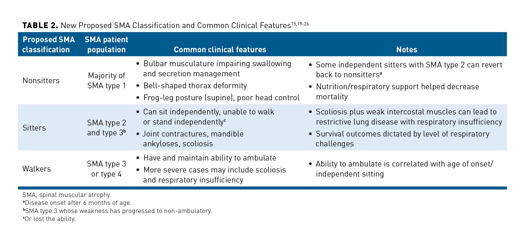 The clinical burden of SMA is highly variable. Historically, SMA was classified into 3 subtypes dependent on the affected individuals’ age of onset and highest achieved motor function (Werdnig Hoffmann disease [type 1], Dubowitz syndrome [type 2], and Kugelberg Welander disease [type 3]) outlined in Table 1.2 The classification system would then expand further (Table 12) to include congenital- or prenatal-onset (type 0, type 1 in later classifications) and adult-onset (type 4).15-18 However, the natural history of SMA has evolved significantly with additional clinical trials and the development of therapeutics resulting in previous classification systems becoming less practical.15 Treated SMA is now considered to lie on a continuum because patients frequently gain motor function versus progressive loss among those untreated. To address these changes, updates to the classification system categorize individuals with SMA as nonsitters, sitters, and walkers while focusing on current functional status and treatment response (Table 2).15,19-26
