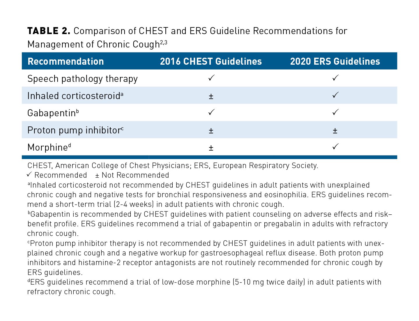 A comparison of CHEST and ERS guideline recommendations for the nonpharmacologic and pharmacologic treatment of chronic cough is outlined in Table 2.2,3 Both guidelines recommend a trial of speech pathology and gabapentin in patients with UCC and recommend against the use of proton pump inhibitors (PPIs) in the absence of gastroesophageal reflux disease (GERD). The guidelines differ in their recommendations of inhaled corticosteroids (ICS) and morphine.2,3 Current options for the management of RCC and UCC will be discussed in further detail in subsequent sections. Chronic cough management is often complex, requiring an individualized treatment plan. Therefore, treatment options discussed below include a summary of efficacy and tolerability data to guide clinical decision making.
