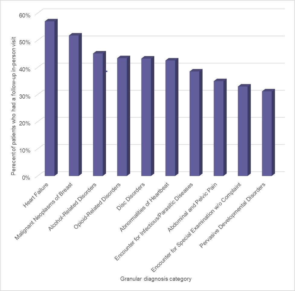 In 2018, the telehealth diagnosis with the highest rate of patients who had an in-person visit within 15 days of a non-hospital-based provider-to-patient telehealth visit for the same or a very similar diagnosis was heart failure (Table 4).