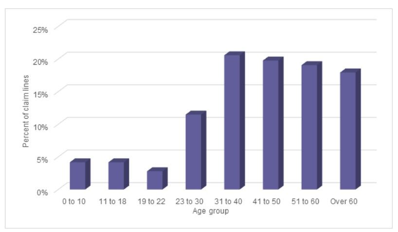 Sixty-five percent of all telehealth claim lines in the period 2014-2018 were associated with females. But for telehealth visits associated with a hospital discharge, 53% of claim lines were submitted for females.