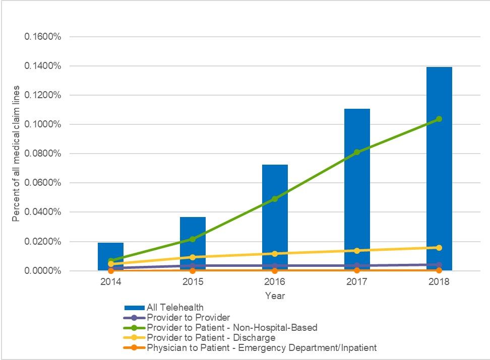 Claim lines related to telehealth overall grew 624% from 2014 to 2018 (Table 1).