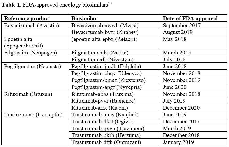 Biological products, which are also referred to as biologic agents or biologics, are generally large and complex molecules produced from living entities such as microorganisms, plant, or animal cells.1 Biologics are used in the diagnosis, treatment, and prevention of many conditions, including those for cancer.1 Over the past few decades, advancement in biomedical technology has led to increased commercialization of biologics, which has impacted cancer care. As cancer care is associated with high cost, the production of a “biosimilar” product that is comparable in clinical efficacy has generated interest to mitigate healthcare-associated costs and improve access to care.2