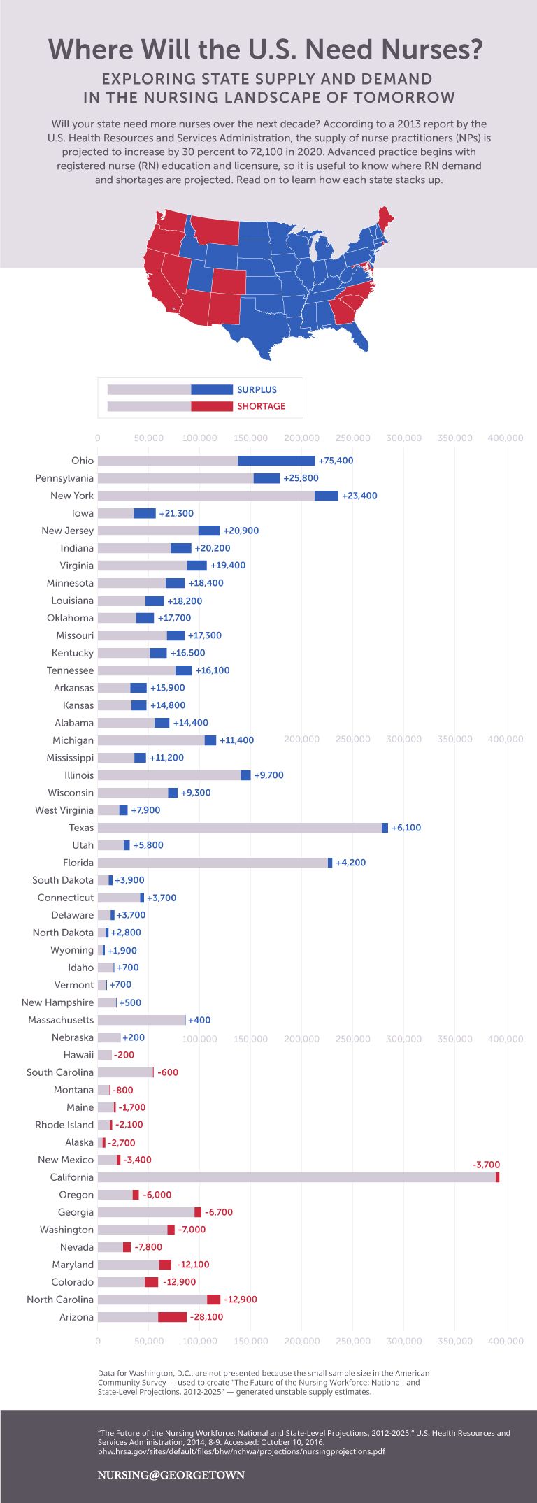 Overall, the United States is predicted to see a shortage of 193,000 nursing professionals by 2020, according to a 2015 report produced by the Georgetown University Center on Education and the Workforce titled, “Nursing: Supply and Demand Through 2020.”